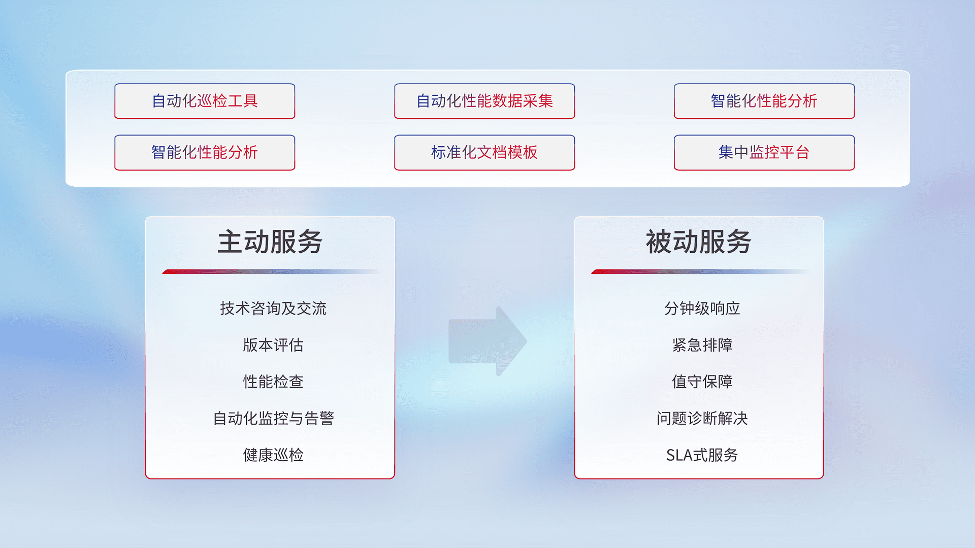 智能化工具和标准化文档,,保障服务质量,,,,提供主动服务(包含技术咨询、、版本评估、、、性能检查、、自动化监控与告警、、健康巡检)和被动服务包含(分钟级响应、、紧急排障、、值守保障、、、问题诊断解决、、、SLA服务)。。。